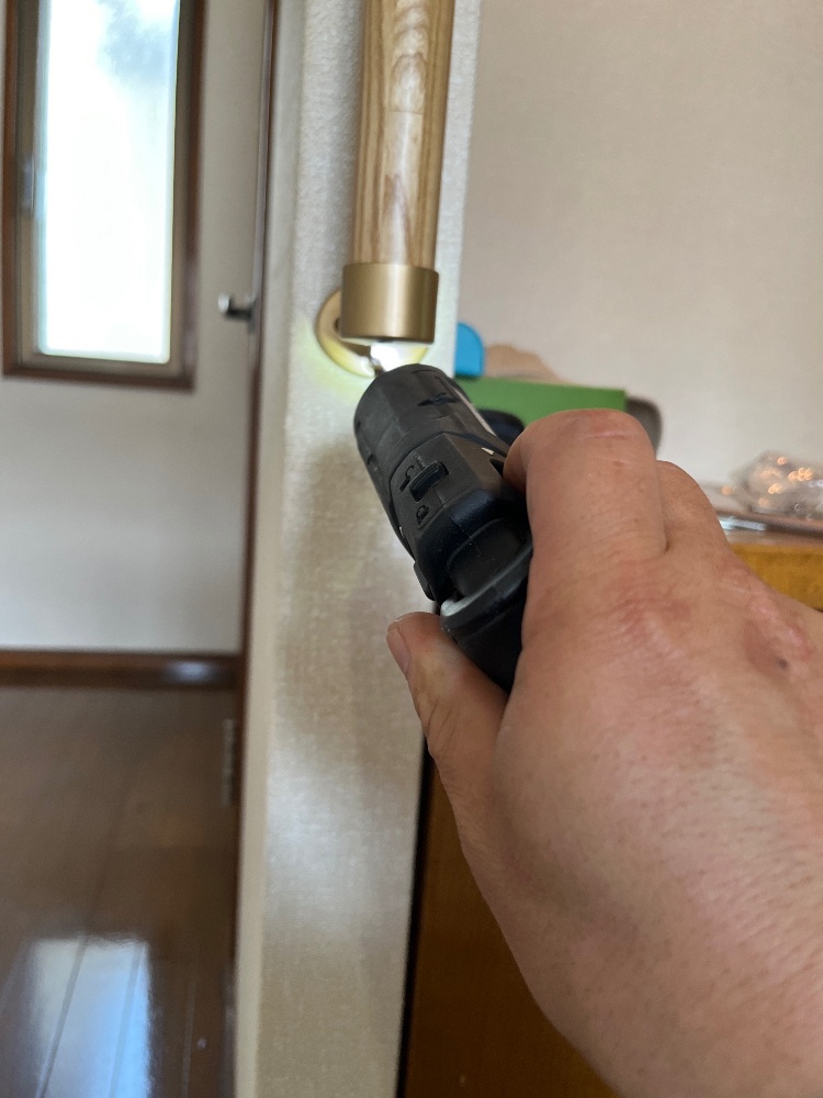 今回取り付けたのは、木目調でお部屋の雰囲気にも馴染む、おしゃれな手摺です。取り付け作業は、お客様にぴったりの高さや位置を相談しながら進めていきます。手摺がグラつかないように、しっかりと固定することが大切です。