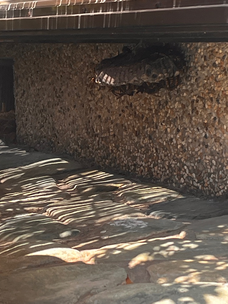今回のご依頼は、軒下などの目立たない場所にできたハチの巣の駆除でした。写真の通り、巣の周りには多くのハチが集まっており、非常に危険な状況です。
