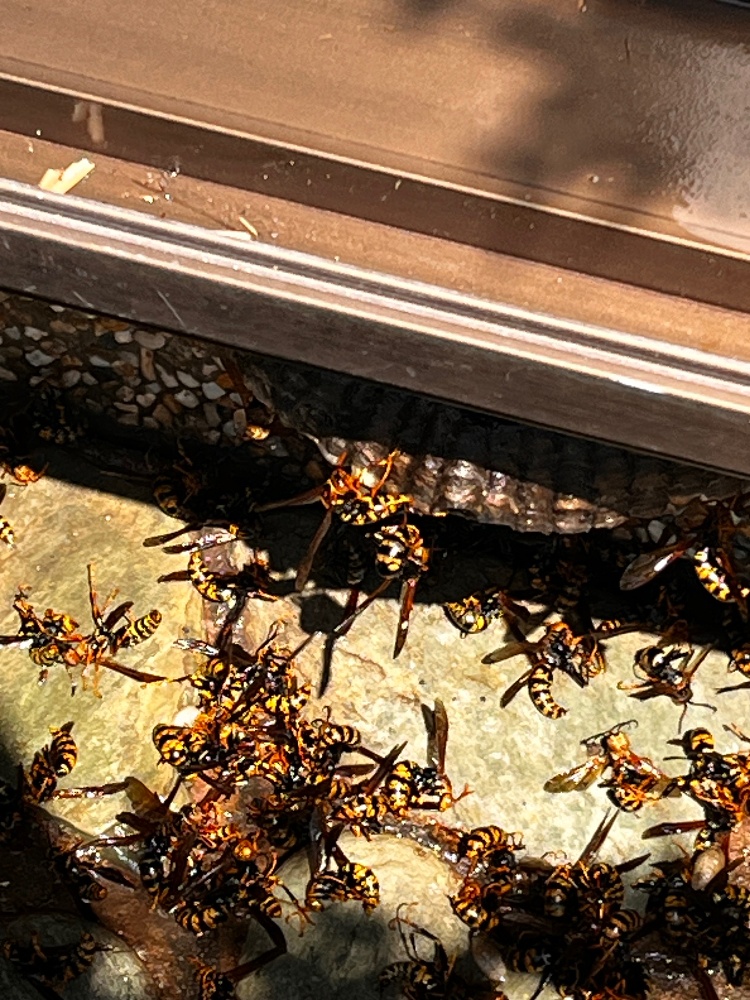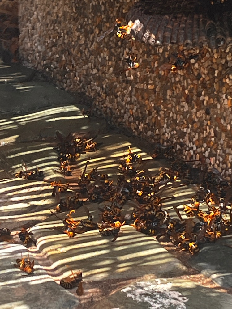 大量にいたハチが、あっという間に駆除され、地面に落下しています。(写真3枚目・4枚目)