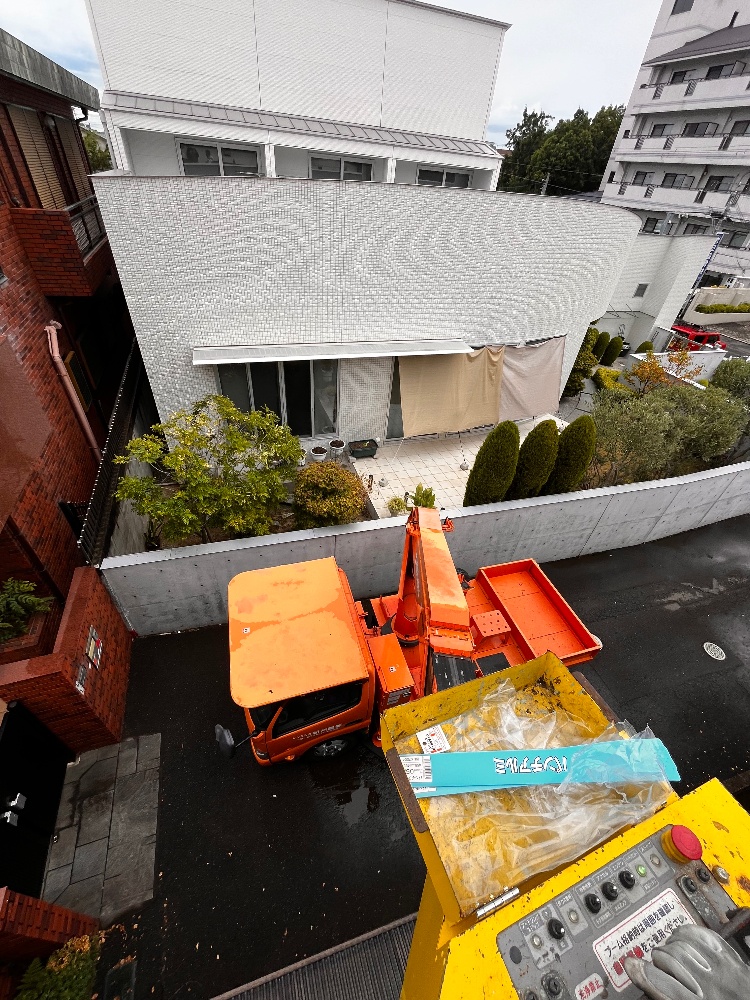 2階の軒下という高所での作業になるため、今回は高所作業車(3枚目の写真に写っているオレンジ色の車輌)を使用して安全に作業を進めました。高所の作業でも、弊社「便利屋助さん」にお任せください!