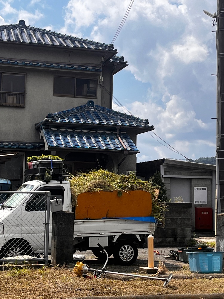 専用の草刈り機で伸びた草を刈り、軽トラック(画像3枚目)に山盛りに積んで回収。