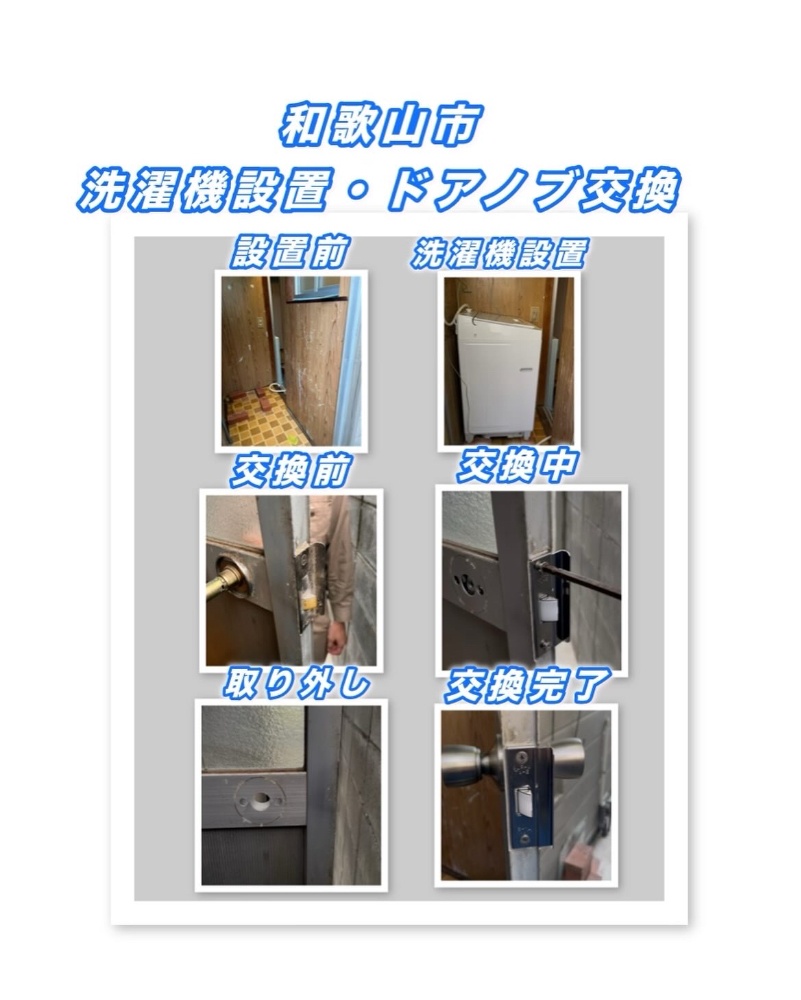 和歌山市にて、洗濯機の設置とドアノブ交換の作業を行いました。引っ越し後の洗濯機設置や、住宅のちょっとした修理にも対応しています。