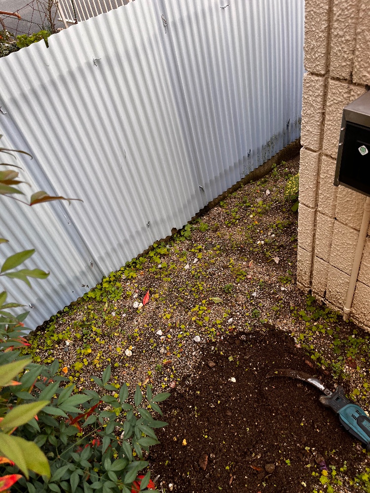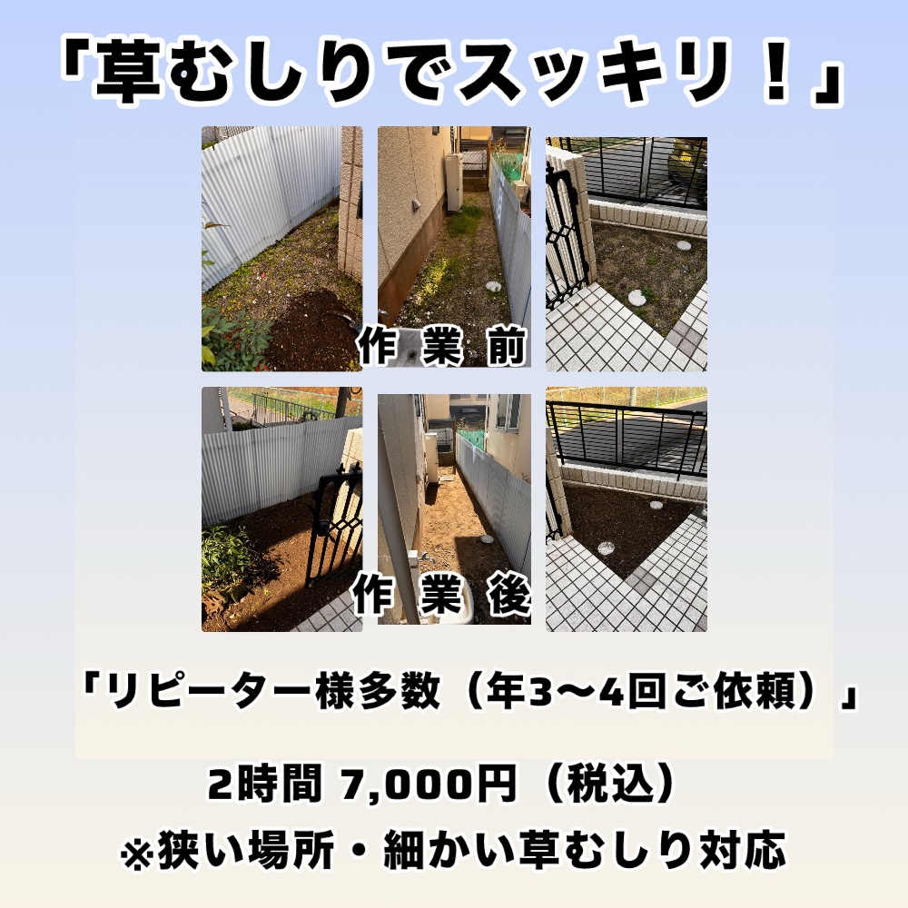 家の横の細いスペースで、雑草が伸びてお困りの状態でしたが、手作業で丁寧に対応しています。