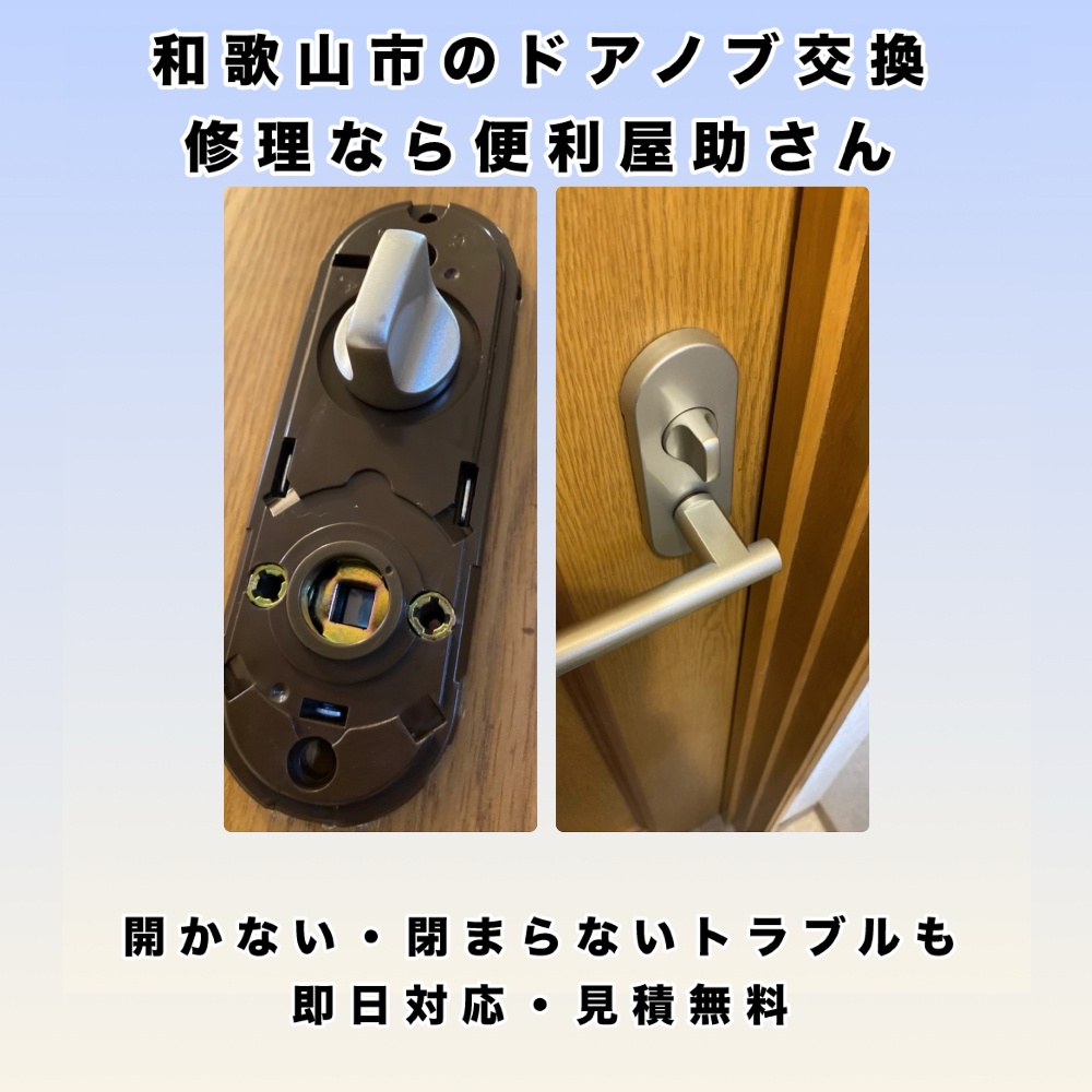 和歌山市のドアノブ交換・ドア修理・ラッチ交換・鍵トラブルなら便利屋助さん。開かない・閉まらないなどの不具合も迅速に対応し、部品交換や調整で解決します。地域密着で対応が早く、格安料金で安心。見積もり無料でお気軽にご相談ください。