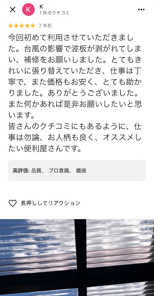 「台風で剥がれた波板の補修にお伺いした際、大変温かいお言葉をいただきました。」