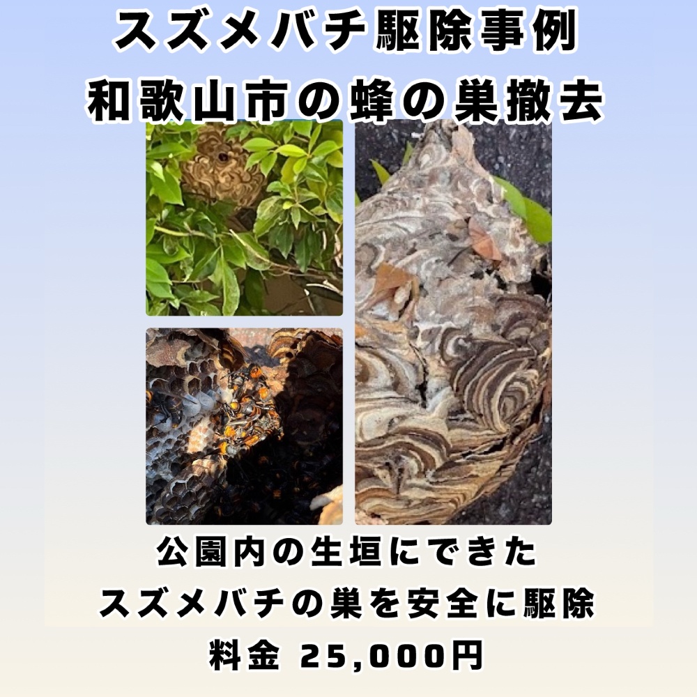 和歌山市の公園内にある生垣にスズメバチの巣ができていたため、安全対策を行い迅速に駆除しました。