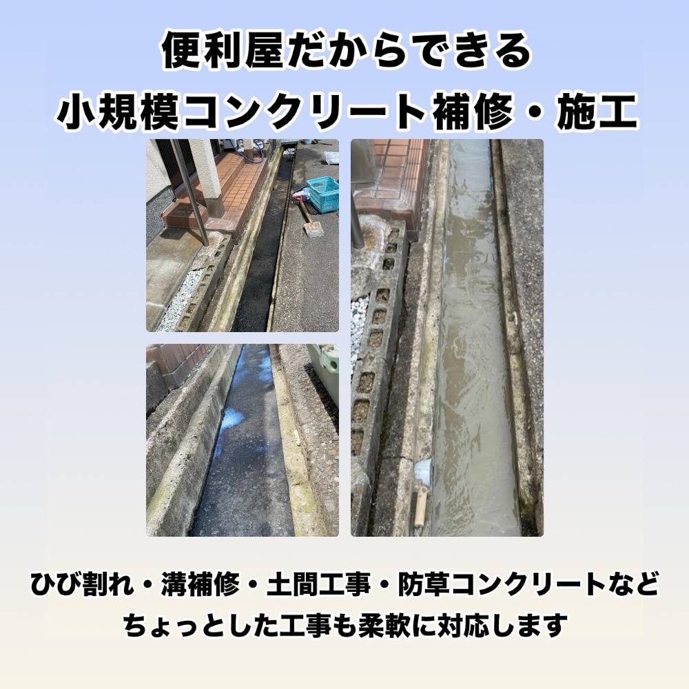 溝の補修やひび割れ補修、防草コンクリート、土間打ちなど、大掛かりな工事まではいらない「ちょっとした施工」に柔軟対応。
