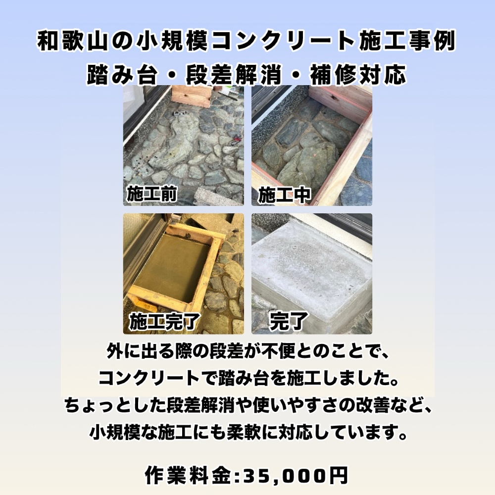 和歌山市を中心に、踏み台の設置や段差解消、防草コンクリート、ひび割れ補修などの小規模コンクリート施工を行っています。